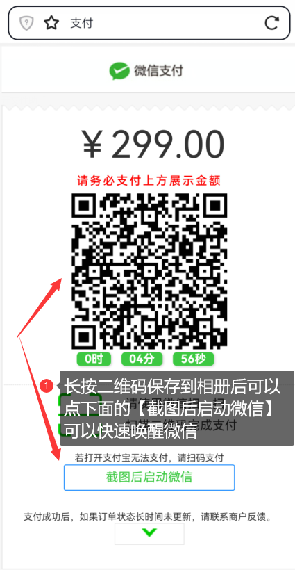 支付时一定要按支付码提示的金额付款。比如299.03这样的。付款时有零头的也一定要填上。