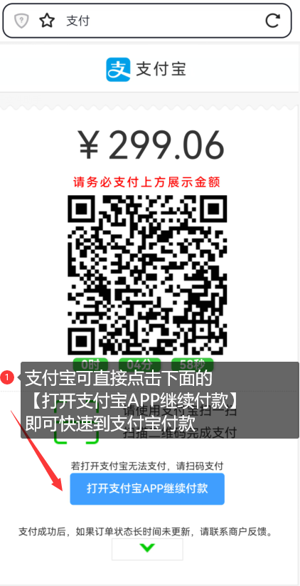 支付宝:点击 打开支付宝APP继续付款 即可